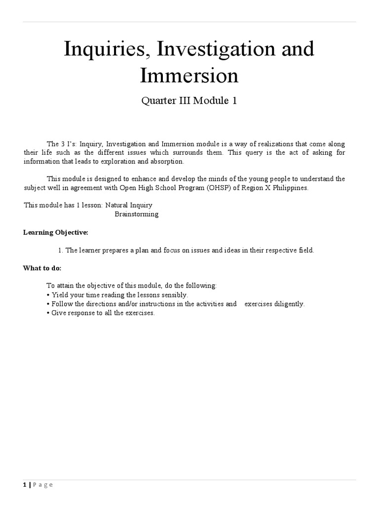Inquiries, Investigation and Immersion Quarter 3 Module1 Inquiries, Investigations, and Module Of Inquiries Investigation And Immersion k to 12 basic education curriculum senior high school applied track subject grade: This is an interactive way to test and evaluate the students’ learning process. activities presented in this module are based on the most essential learning competencies (melcs) for inquiries,. Identifying the problem and asking the question. what to do in dealing the ohsp students.. Module Of Inquiries Investigation And Immersion.
